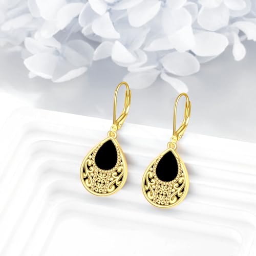 Black Onyx Drop Earrings for Women Sterling Silver 14k Gold Plated Filigree Dangle Leverback Earrings Jewelry Gift for Girls