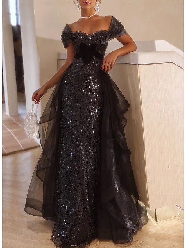Black Tie A-Line Prom Dresses Vintage Dress Formal Floor Length Short Sleeve Square Neck Tulle with Glitter