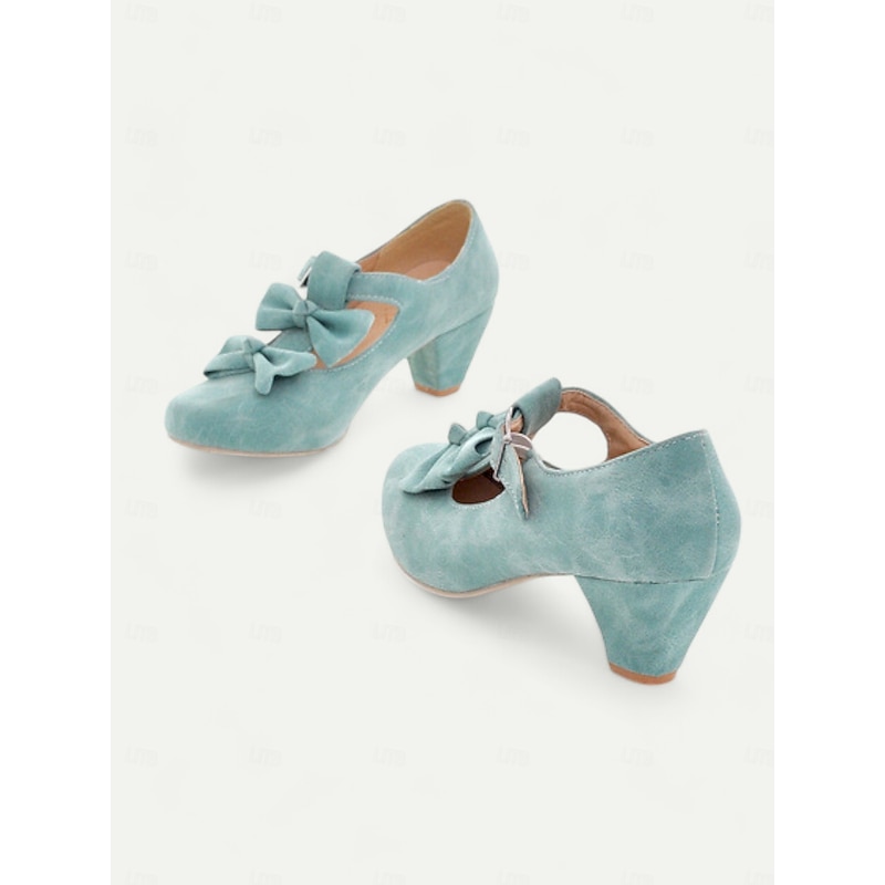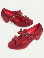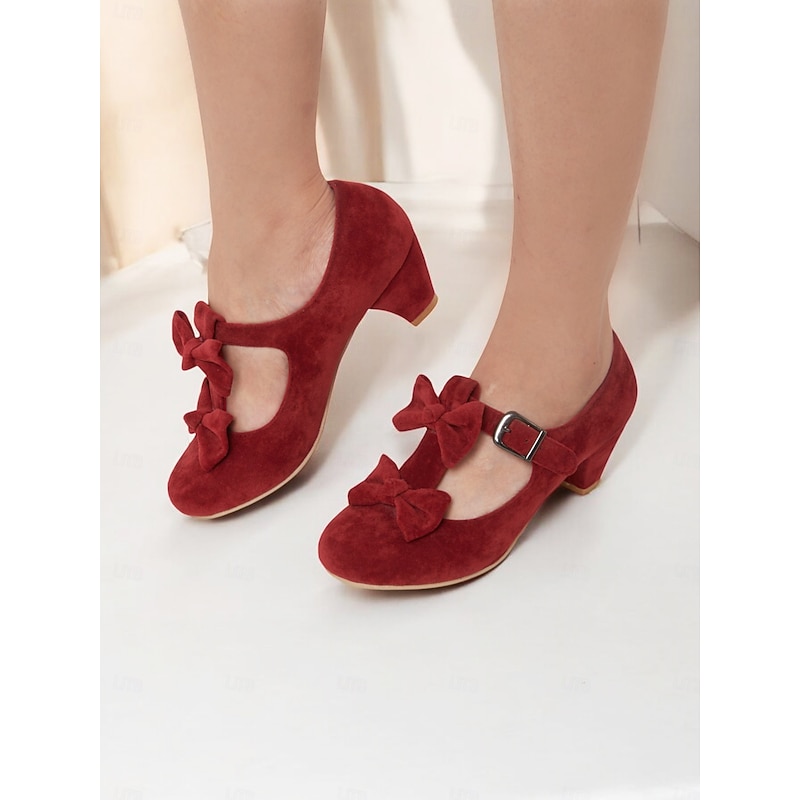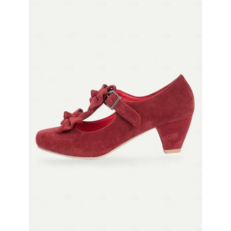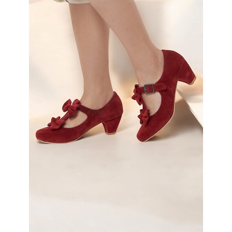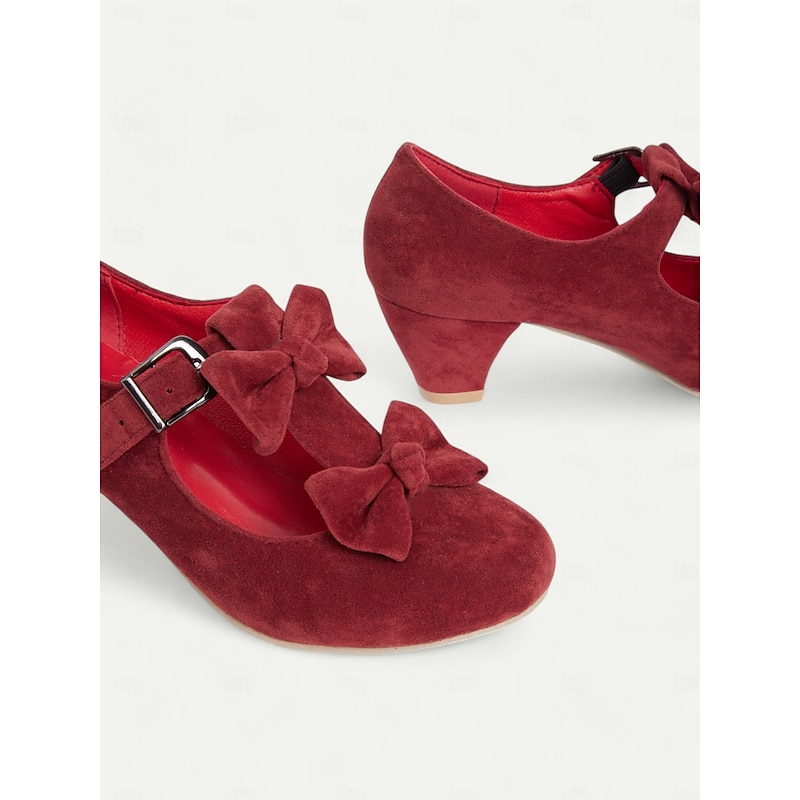 Highlights [Fabric] : Crafted from faux suede and PU, these women's vintage Mary Jane heels feature a soft and luxurious texture that enhances both the comfort and the elegant appearance of the shoes. [Silhouette] : Combining a classic Mary Jane silhouette with a mid-height cone heel, these shoes provide stability and comfort for prolonged wear. Their vintage and elegant style make them a timeless addition to any wardrobe. [Design Highlights] : The front strap is adorned with three charming bowknots, offering a playful yet feminine detail. An adjustable buckle ensures a customizable and secure fit. The T-strap design adds a touch of sophistication, complemented by a rich burgundy color for a chic and modern look. [Occasions] : Suitable for various occasions, these heels effortlessly elevate your outfit, whether it's a formal event, a casual day in the office, or a lively party. Their versatility makes them perfect for any season, from spring to winter. [Size] : Available in a range of sizes from US5.5 / EU35 / UK3.5 to US10.5 / EU42 / UK8.5, these shoes are designed to offer a comfortable fit according to your usual size. Perfect for everyday use. superior materials and excellent craftsmanship ensure long-lasting durability.