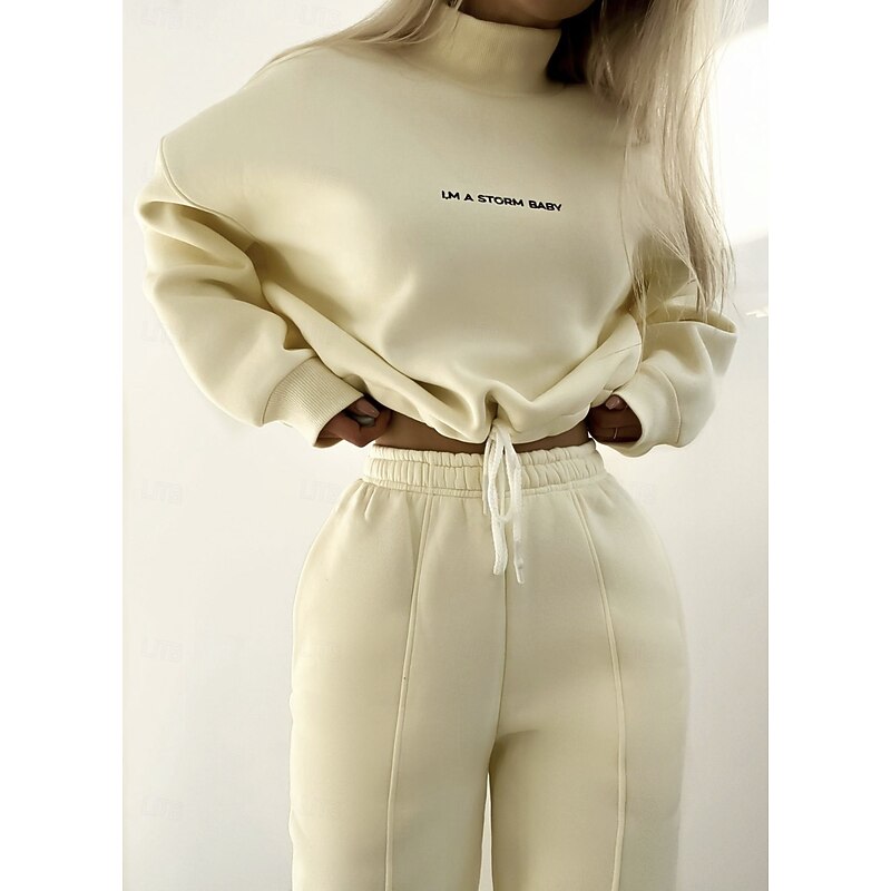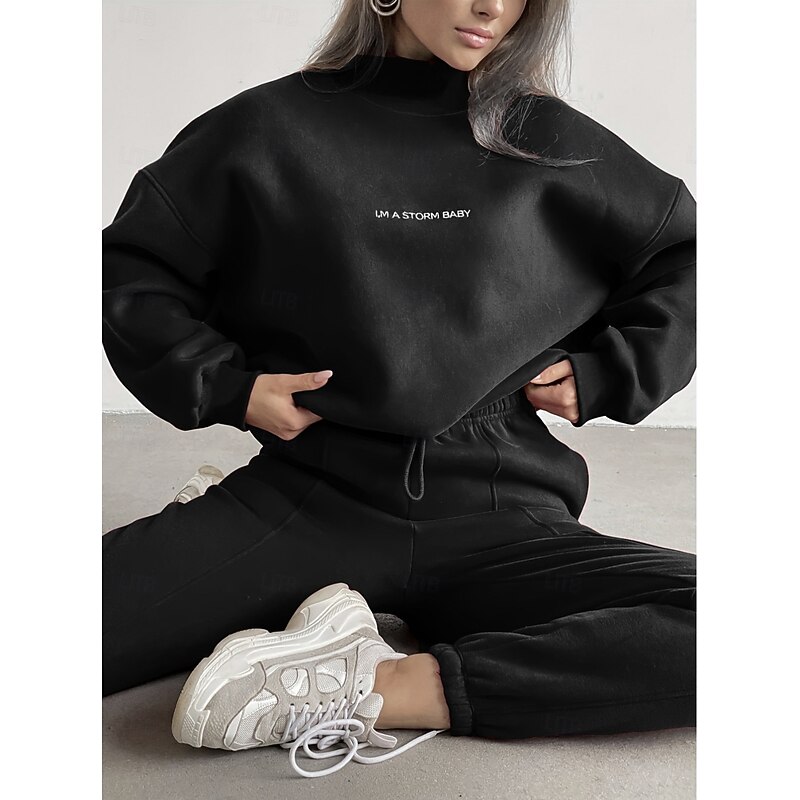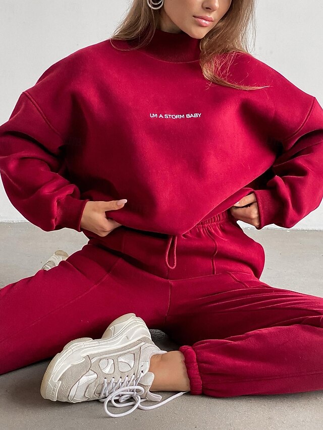 Highlights [Fabric:] Crafted from a soft and cozy fleece-lined fabric, this women's sweatshirt set is designed for warmth and comfort, ideal for cooler spring, fall, and winter days. The material is stretchy, ensuring a snug fit that moves with you. [Silhouette:] The oversized sweatshirt offers a relaxed fit with a crew neck, providing both style and comfort. Matched with fleece pants that feature an elastic waistband and cuffs, this set ensures an easy, flattering fit suitable for various body types. [Design Highlights:] The sweatshirt boasts a solid color with a subtle letter print, offering a modern urban aesthetic. The high neck design adds an extra layer of warmth while contributing to the contemporary silhouette. The straight-leg fleece pants complete the ensemble, leaning into the current trend of relaxed, yet chic casual wear. [Occasions:] Perfect for outdoor activities such as running errands or casual outings. This set combines practicality with style, making it a versatile choice for a laid-back yet chic look. Pair it with chunky sneakers to elevate your style. [Size Range:] Available in a variety of colors including Black, Red, Beige, and Light Brown, this set comes in sizes S, M, L, and XL ensuring a fit for multiple preferences and body types. Perfect for everyday use. first-class materials and excellent craftsmanship ensure long-lasting durability.
