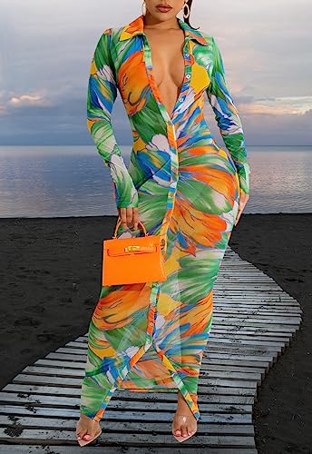 Women's Sexy Summer Sheer Mesh Dresses Button Down Long Sleeve See Through Swimwear Maxi Dress