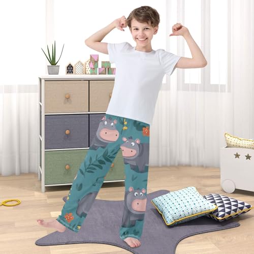 Cartoon Hippo Floral Boys Long Pants tender Trousers Elastic Waist Kids Lounge Bottoms with Pockets S-XL