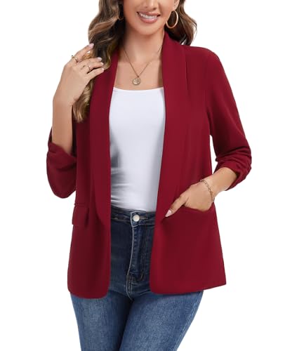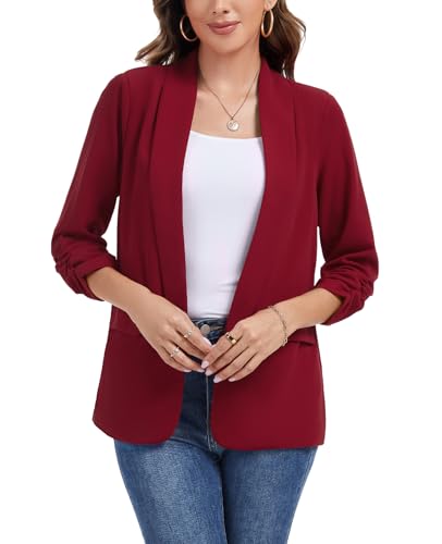 Women's Ruched 3/4 Sleeve Blazers Casual Shawl Lapel Work Padded Shoulder Open Front Blazer Jackets Pocket
