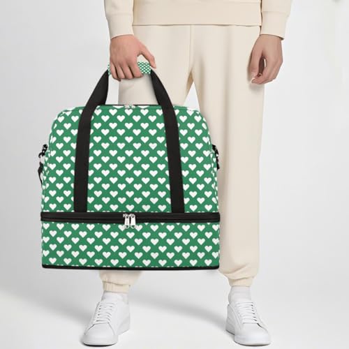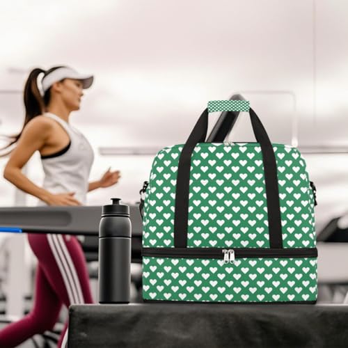 Sports Gym Bag Green Heart Dots Large Travel Duffel Bag With Shoe Compartment Foldable Waterproof Carry-On Weekend Travel Bags for Camping Overnight Yoga Hospital Travel Bags
