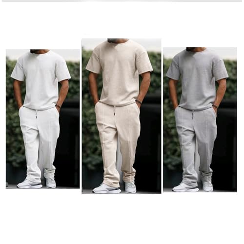 Mens Casual Solid Color Two Piece Suit, Waffle Round Neck Short Sleeve Top and Athletic Drawstring Jogging Pant with Pockets