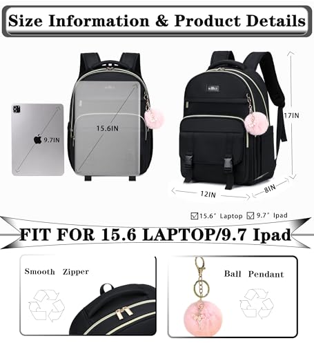 【Medium Size & Giveaway】The girls school backpack dimensions of 17 x 12 x 8 inches (H x L x W) ,with a total weight of 1.7 lbs.The laptops bag with padded compartment sleeve fit tablet 14 ,15,16 inch. This bag sacks also along with fluffy ball key pendant makes the back pack more fashionable and exceptional.【Waterproof Material &premium Zipper】:The waterproof lady backpack purse is made of waterproof, high-quality polyester nylon with cotton lining.The smooth metal zippers closure are used by the premium quality zippers to ensure the long-lasting usage.【Large Capacity&Multi-compartments】: The lightweight bookbags has 6 separate compartments and two side elastic pockets. Front 4 tool compartments come with multiple pockets to provide roomy space for necessities which make your items organized and easier to find; The main compartment of includes laptop padded sleeve and inner zipper pockets. Elastic side pockets:water bottle,small compact umbrella. Theft Proof Back Pocket:Passport, Cellphone, Wallet.【Comfortable Design & Reinforced Straps】:The shoulder straps of woman work knapsack are specially designed wider than usual to ease the stress on your shoulder; Each strap is sewn on securely and padded for comfort.The luggage belt on the back can be fitted on luggage/suitcase to make your journey more convenience【Occasion】: The fashion ladies backpacking purses is perfects for short trip,business travel, weekend getaways, shopping, professional office work and other outdoor activities.Various classic colors for you to choose.Also, the multifunctional book bag can be a a practical schoolbag for university , middle high school student,girls,teens,ladies. Perfect for everyday use. superior materials and excellent craftsmanship ensure long-lasting durability.